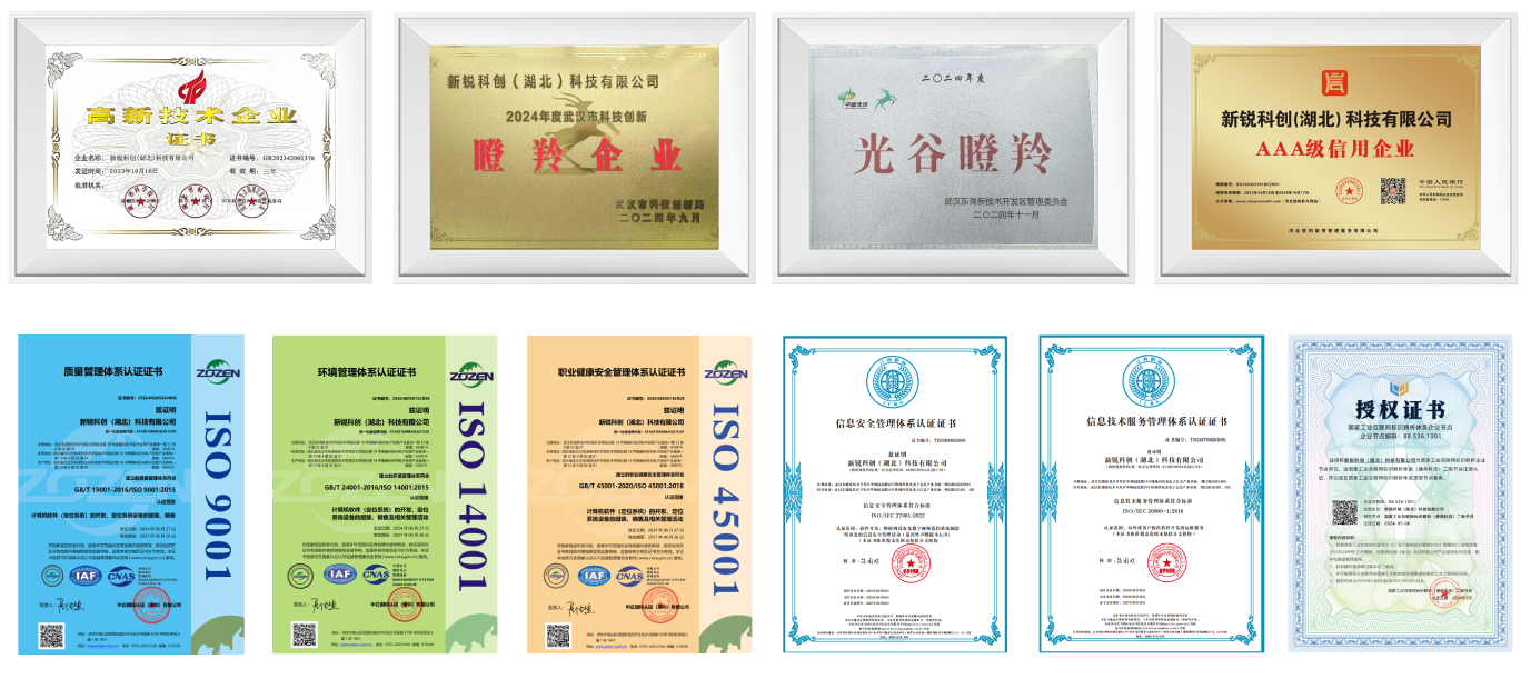新銳科創獲得了20+項企業認證,包括:高新技術企業、瞪羚企業、AAA級信用企業、ISO管理體系認證等。