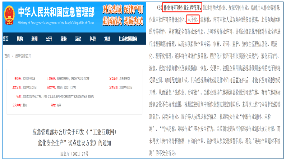 2021年4月7日,應急管理部辦公廳發布印發《“工業互聯網+危化安全生產”試點建設方案》的通知,方案對作業許可和作業過程管理作出了明確指示,要求特殊作業審批許可條件條目化、電子化、流程化等。