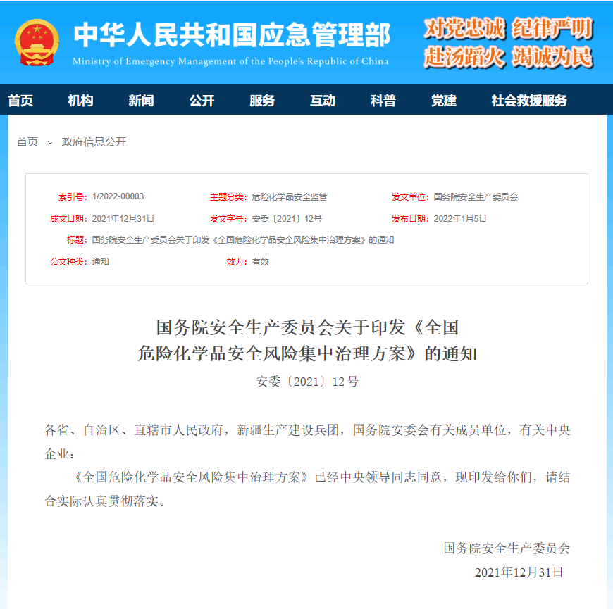2022年1月5日,國務(wù)院安全生產(chǎn)委員會發(fā)布關(guān)于印發(fā)《全國危險化學品安全風險集中治理方案》的通知(安委〔2021〕12號)。