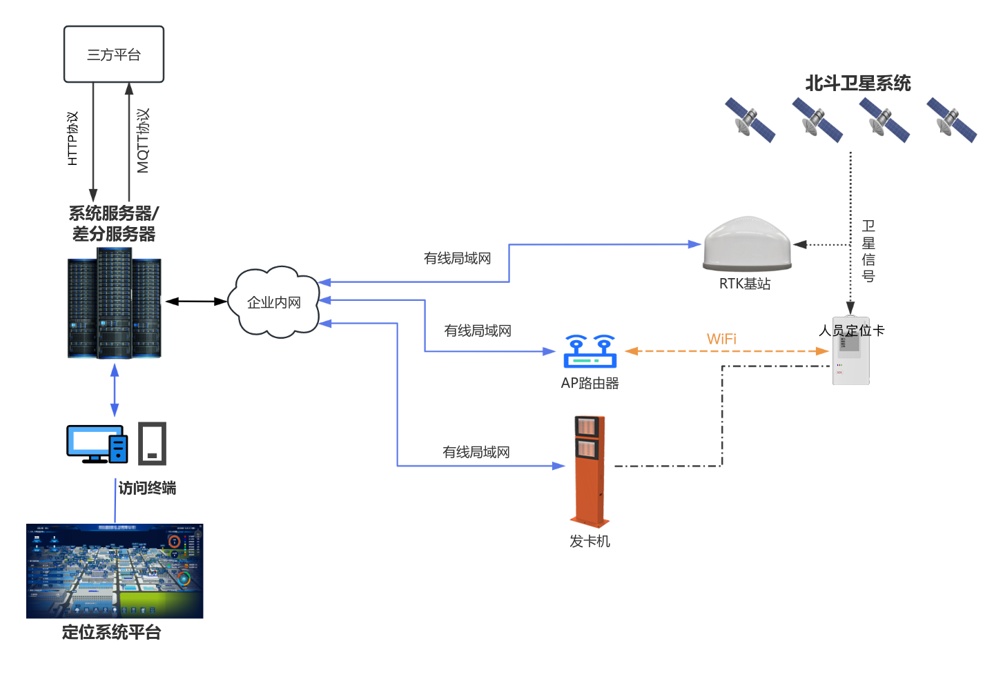 從技術(shù)原理來看,系統(tǒng)利用技術(shù)協(xié)同實(shí)現(xiàn)高精度定位與數(shù)據(jù)傳輸。RTK實(shí)時(shí)動(dòng)態(tài)載波相位差分技術(shù)作為核心定位模塊,通過在電站內(nèi)架設(shè)固定的差分基準(zhǔn)站,接收多衛(wèi)星系統(tǒng)信號并結(jié)合已知坐標(biāo)計(jì)算修正值,再將修正數(shù)據(jù)通過自建WIFI網(wǎng)絡(luò)傳輸至移動(dòng)終端(人員定位標(biāo)簽、車輛定位設(shè)備)。移動(dòng)終端同時(shí)接收衛(wèi)星信號與基準(zhǔn)站修正數(shù)據(jù),經(jīng)系統(tǒng)算法融合運(yùn)算后,快速輸出精準(zhǔn)位置信息,有效抵消衛(wèi)星信號受大氣折射、地形遮擋等因素造成的誤差,大幅提升定位精度。而WIFI網(wǎng)絡(luò)作為數(shù)據(jù)傳輸載體,采用工業(yè)級WIFI組網(wǎng)技術(shù),可根據(jù)電站規(guī)模靈活部署無線AP,構(gòu)建覆蓋全電站的局域網(wǎng)絡(luò),支持定位數(shù)據(jù)、預(yù)警信息、指令信號的高速低延遲傳輸,且具備抗干擾強(qiáng)、穿透性佳的特點(diǎn),能適應(yīng)光伏電站復(fù)雜的室外電磁環(huán)境。