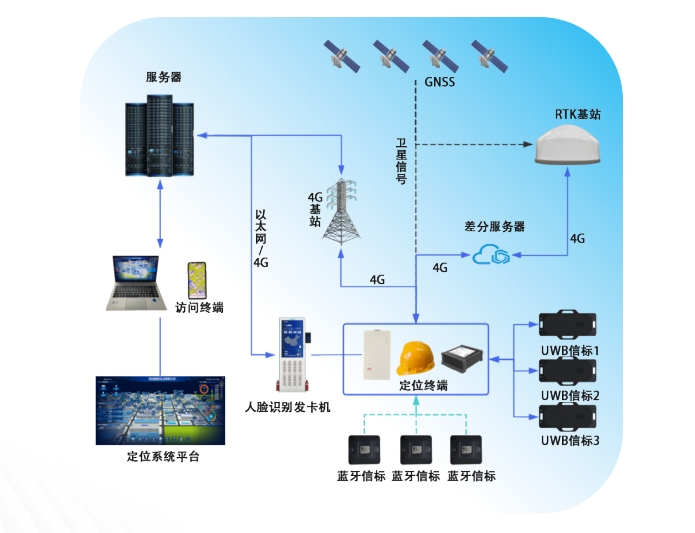 5G+UWB+RTK融合定位系統結合了5G通信技術、超寬帶(UWB)定位技術和實時動態載波相位差分(RTK)定位技術,實現了高精度、實時性強、抗干擾能力強的人員定位服務。這一系統不僅適用于室外開闊區域,還能夠在室內復雜環境中提供穩定的定位服務。