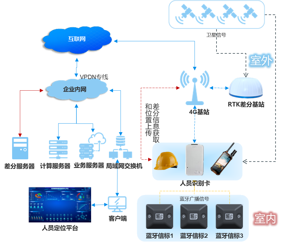 在室外關鍵位置安裝RTK差分基站,RTK差分基站接收衛星信號,計算出差分信息后通過4G網絡傳輸給差分服務器,差分服務器實時刷新最新的差分信息;定位終端接收衛星信號,通過4G網絡從差分服務器獲取最新的差分信息,計算出自身精確位置,然后通過4G網絡將位置信息傳輸到服務器;服務器與地圖引擎進行信息處理后,在展示終端展現人員位置。