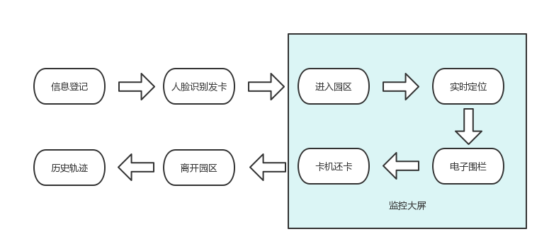 人員/車輛進入園區前,提前登記相關信息,到達園區入口處通過人臉識別發卡機自動發卡,車載定位標簽通過人員發放,獲取定位標簽;