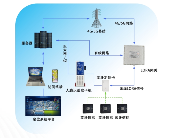 LoRa網關收集定位卡發送的信息,并通過4G/5G或有線局域網將定位卡信息及定位卡轉發出來的信標信息發送給定位服務器。
